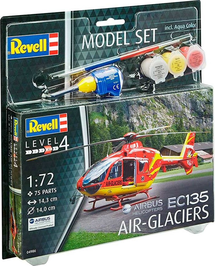 Revell - EC135 Air-glaciers Modelhelikopter - 1:72 - Level 4 er det ideelle valg for både nybegyndere og erfarne modelbyggere. Denne imponerende modelhelikopter er designet med stor opmærksomhed på detaljer og giver dig mulighed for at skabe en troværdig repræsentation af den velkendte EC135 helikopter, der anvendes i redningsmissioner og luftambulancer.