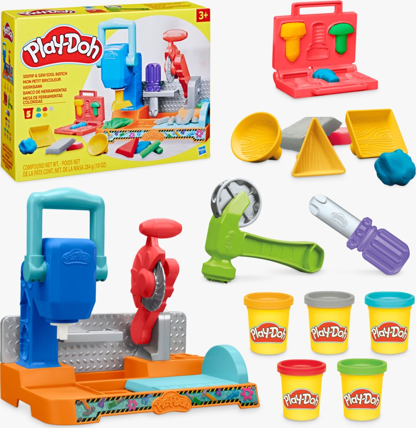 Play-Doh Værktøjsbænken er et helt fantasiværksted i én kasse! Børn kan lege træbearbejdning med det indbyggede stempler og rundsaven, plus ekstra Play-Doh-værktøjer. De medfølgende 56 grams...