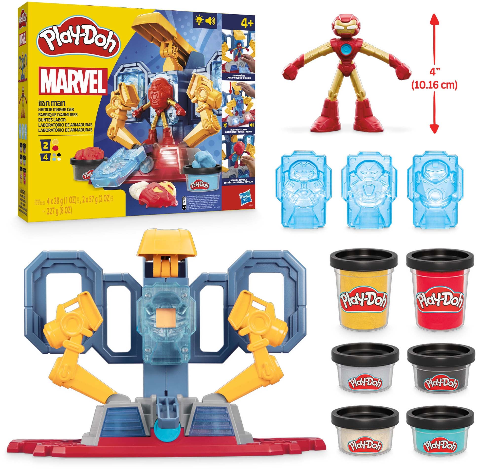 Legesæt fra Play-Doh med inspirerende tilbehør til at skabe forskellige former af modellervoksen. Perfekt til kreative aktiviteter. - Indeholder: 6 modellervoksbøtter, 3 forme, 1 figur, 1 redskab til modellervoks. - Skab Iron Mans rustning i hans laboratorie! - Lys- og lydeffekter. - Figurhøjde: ca. 10 cm. - Kun fantasien sætter grænserne. - Flere stykker sjovt tilbehør. - Let at forme. - Indeholder ca. 227 g play-doh. - CE-mærket. - Anbefalet alder: Fra 4 år. - Plastik. - Batterier medfølger ikke.