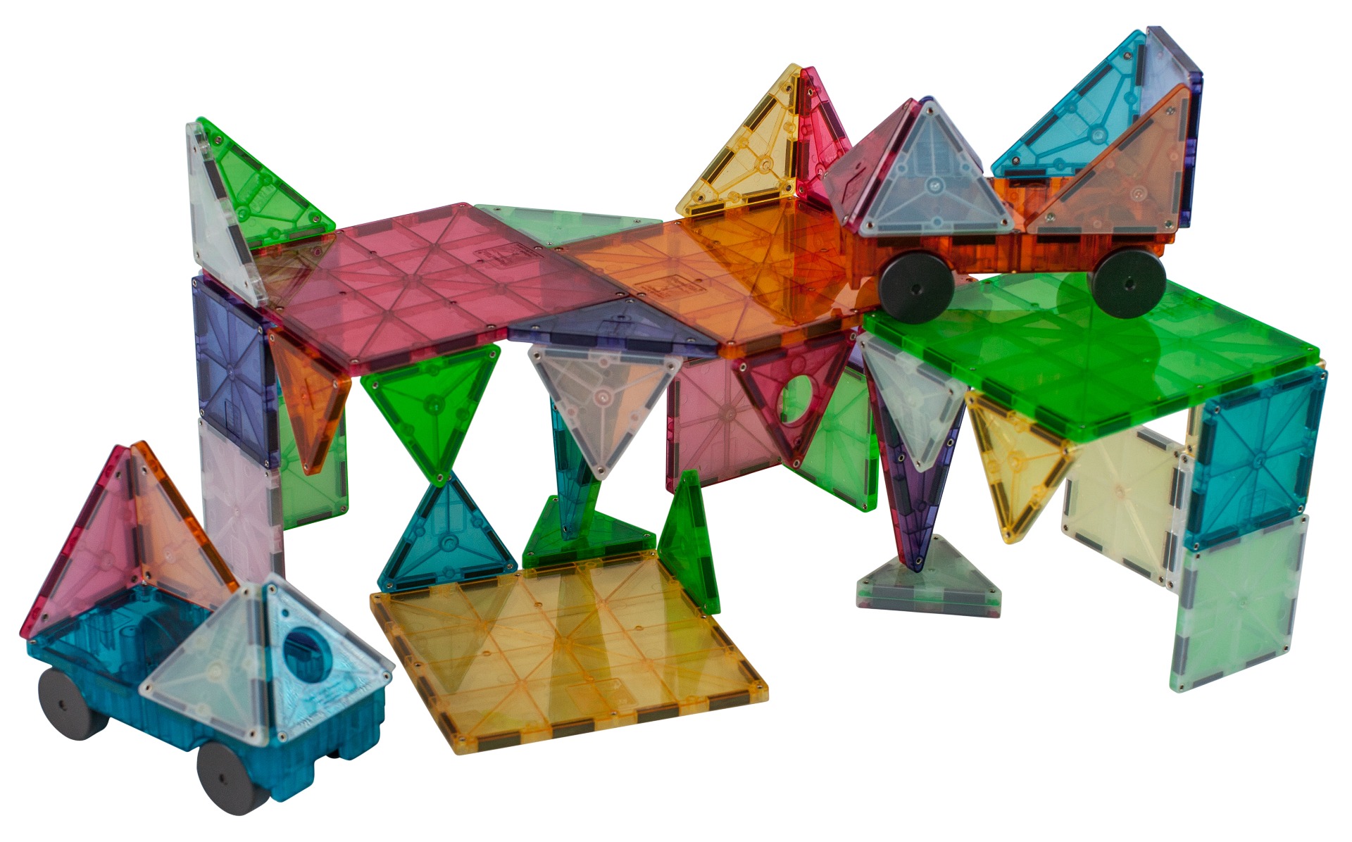 Det magnetiske kvalitetsbyggelegetøj Magna_tiles udfordrer og inviterer børn til bruge geometriske former til at bygge alt fra helt enkle til meget komplicerede konstruktioner - ligesom en bro eller en fodbold består af geometriske former. Magna-Tiles er magnetiske på alle leder og kanter, så de hæfter til hinanden via deres magnetisme. Brikkerne fås i mange forskellige farver, former og temaer, så uanset om dit barn er til dyr eller spejlkabinetter, så er Magna-Tiles en super god ide.