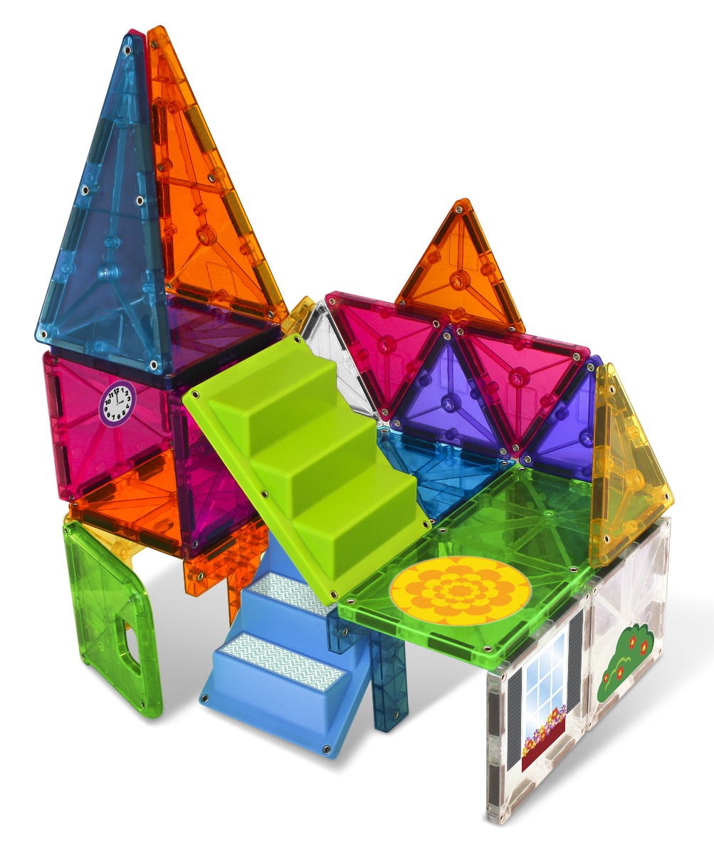 Det magnetiske kvalitetsbyggelegetøj Magna_tiles udfordrer og opfordrer ungerne til bruge geometriske former til at bygge alt fra helt enkle til meget komplicerede konstruktioner - ligesom en bro eller en fodbold består af geometriske former. Magna-Tiles er magnetiske på alle leder og kanter, så de hæfter til hinanden ved deres magnetiske egenskaber. Brikkerne fås i mange forskellige temaer, udformninger og størrelser. Med spejle, gennemsigtige og med figurer. Der er noget for ethvert barns smag.