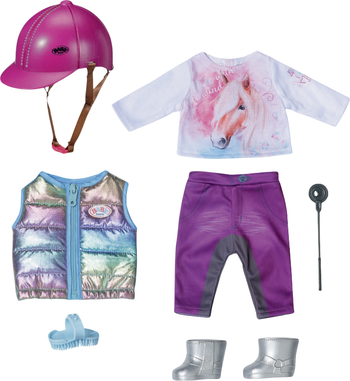 Til en dag i hestestalden har den lille rytter brug for det rigtige outfit: en langærmet bluse med hestemotiv, en vest, så hun kan holde varmen på rideturen, sa mt ridebukser og ridestøvler, så hun kan sidde sikkert i sadlen Naturligvis skal der også en p