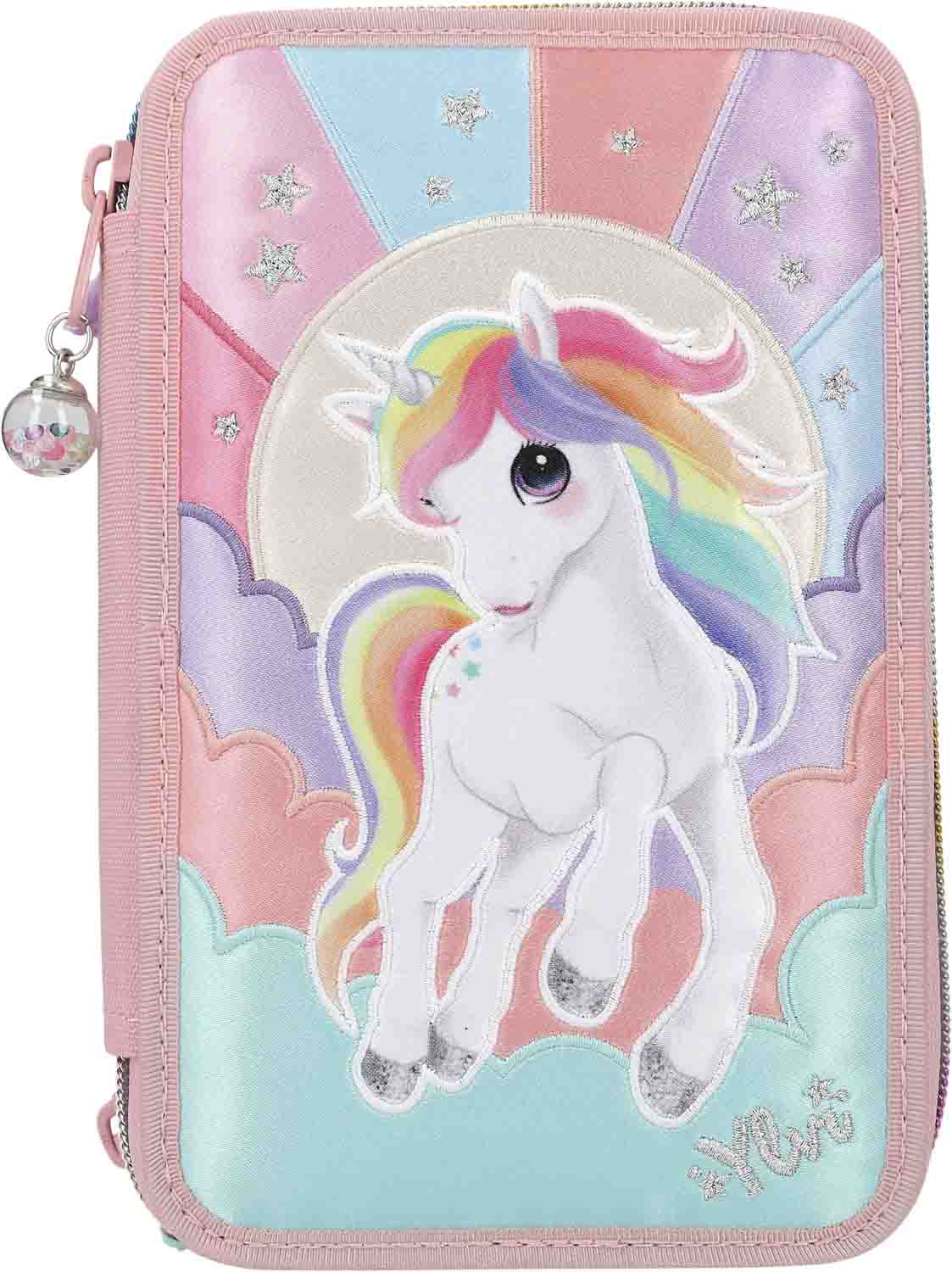 Superflot penalhus fra Ylvi med enhjørningen Naya applikeret på regnbuebaggrund i skinnende satin materiale. Penalhuset indeholder tre store rum (inkl. tilbehør