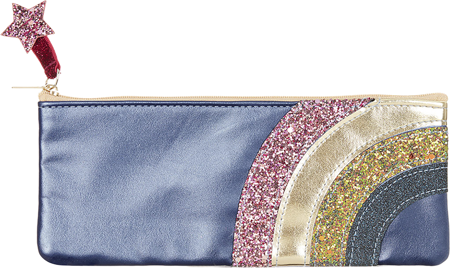 Penalhus i blåt satin, dekoreret med en regnbue og et lille stjerneskud-vedhæng på lynlåsen.Alder: 3-8 år