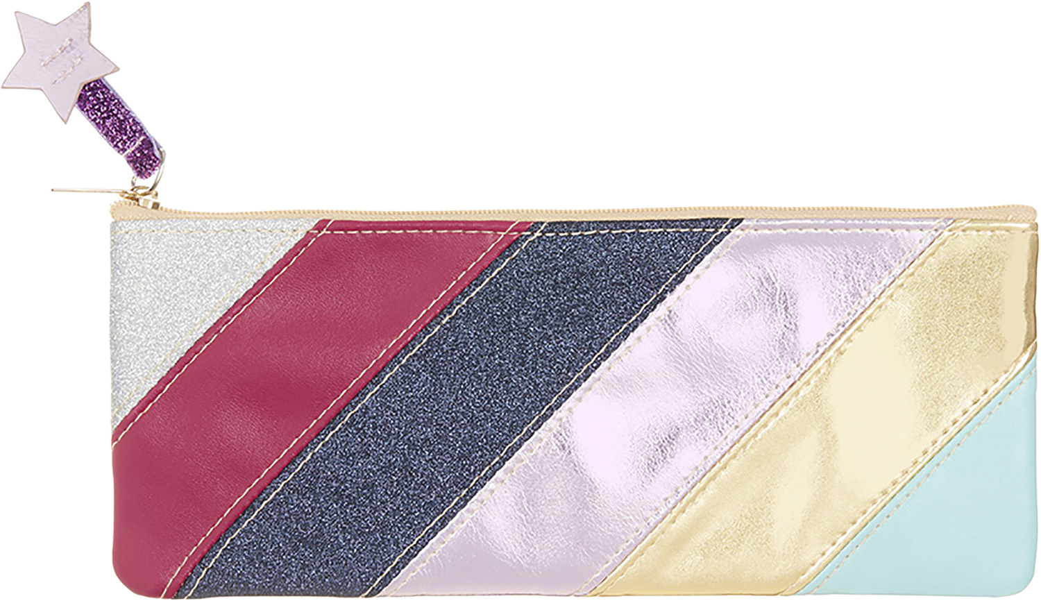 Penalhus med diagonale striber i flotte farver samt et lille stjerneskud-vedhæng på lynlåsen.Alder: 3-8 år