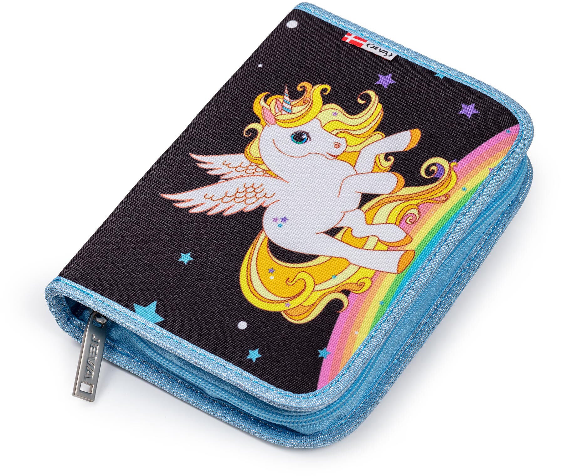 One-Zip penalhus fra Jeva med et glitrende enhjørningetema. Det har ti dobbeltsidede farveblyanter og to blyanter. Penalhuset har en lineal, et viskelæder og en blyantspidser. Det har en lomme i mesh til småting. Perfekt til skolestart. Stort rum med lynlås. Lille netlomme. Indeholder tilbehør, der er perfekt til skolestart! Indeholder: 10 farveblyanter, 2 blyanter, 1 viskelæder, 1 lineal, 1 blyantspidser. Nylon, polyester.