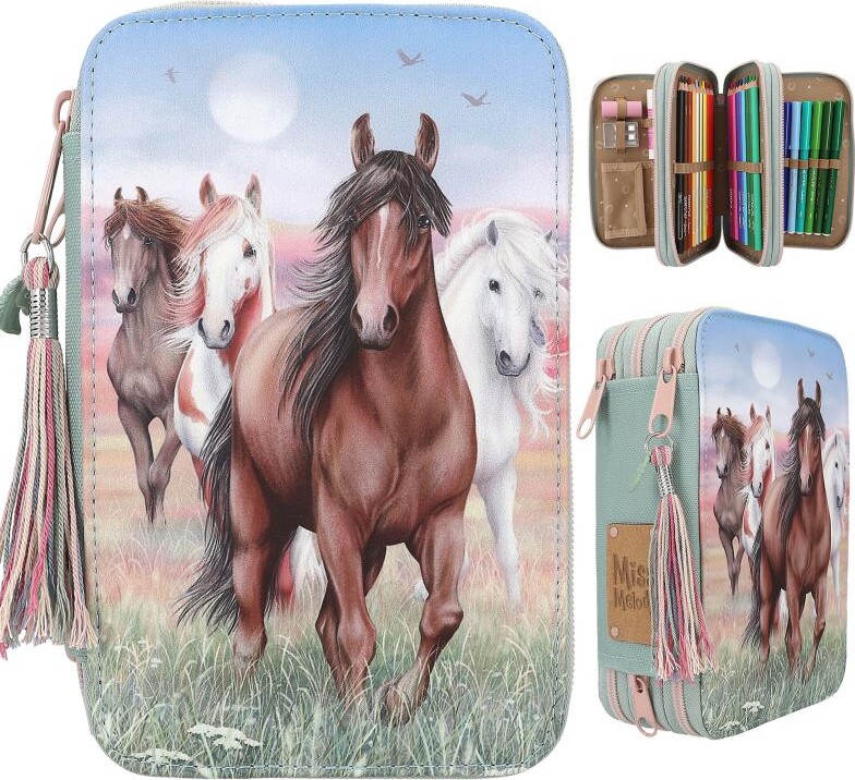 Flot penalhus i afdæpet grøn og ros har motiv af fire smukke heste i galop på en græseng fra...