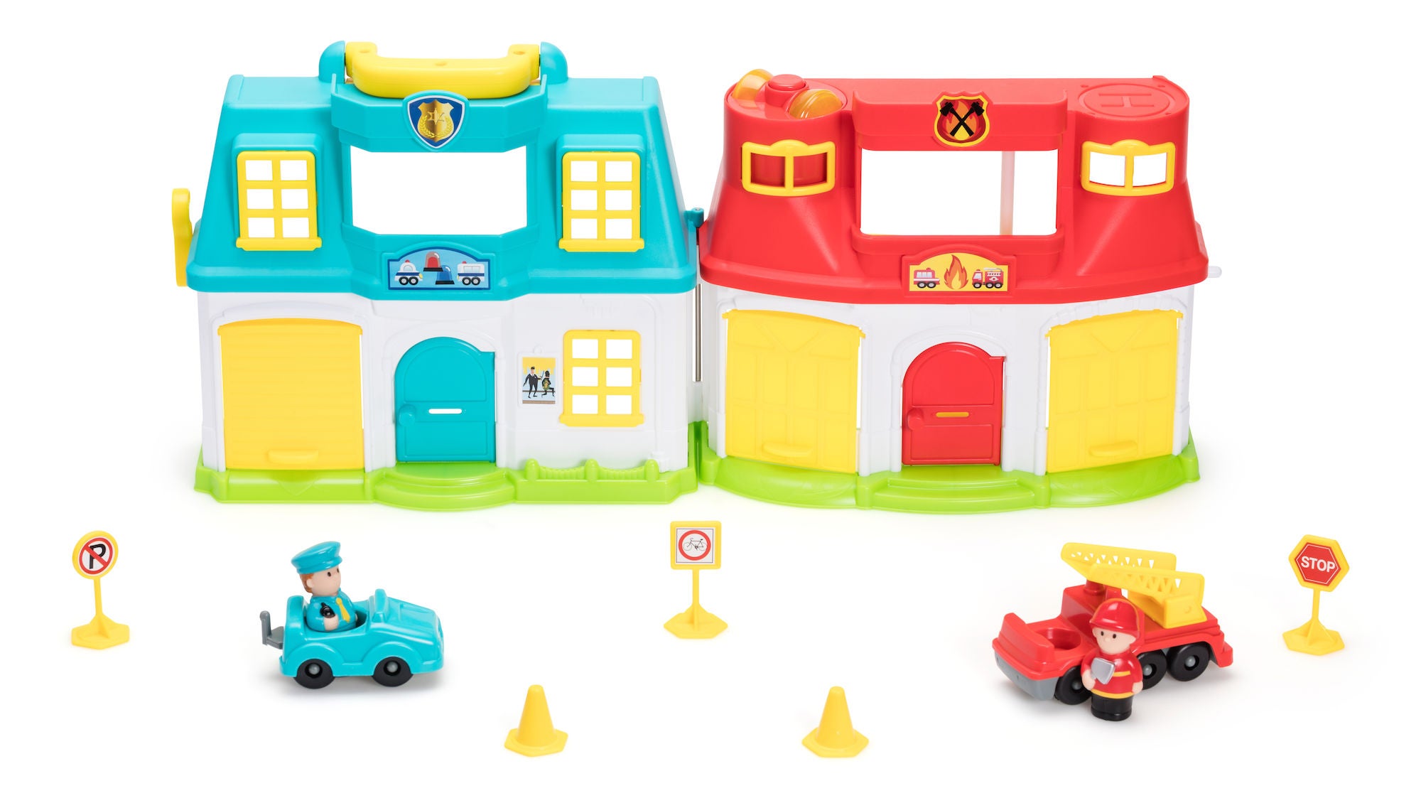 En redningsstation fra Redbox. En del er en politistation og den enden del er en brandstation. Du får også en politibetjent, en brandmand, en politibil en brandbil og vejskilte.