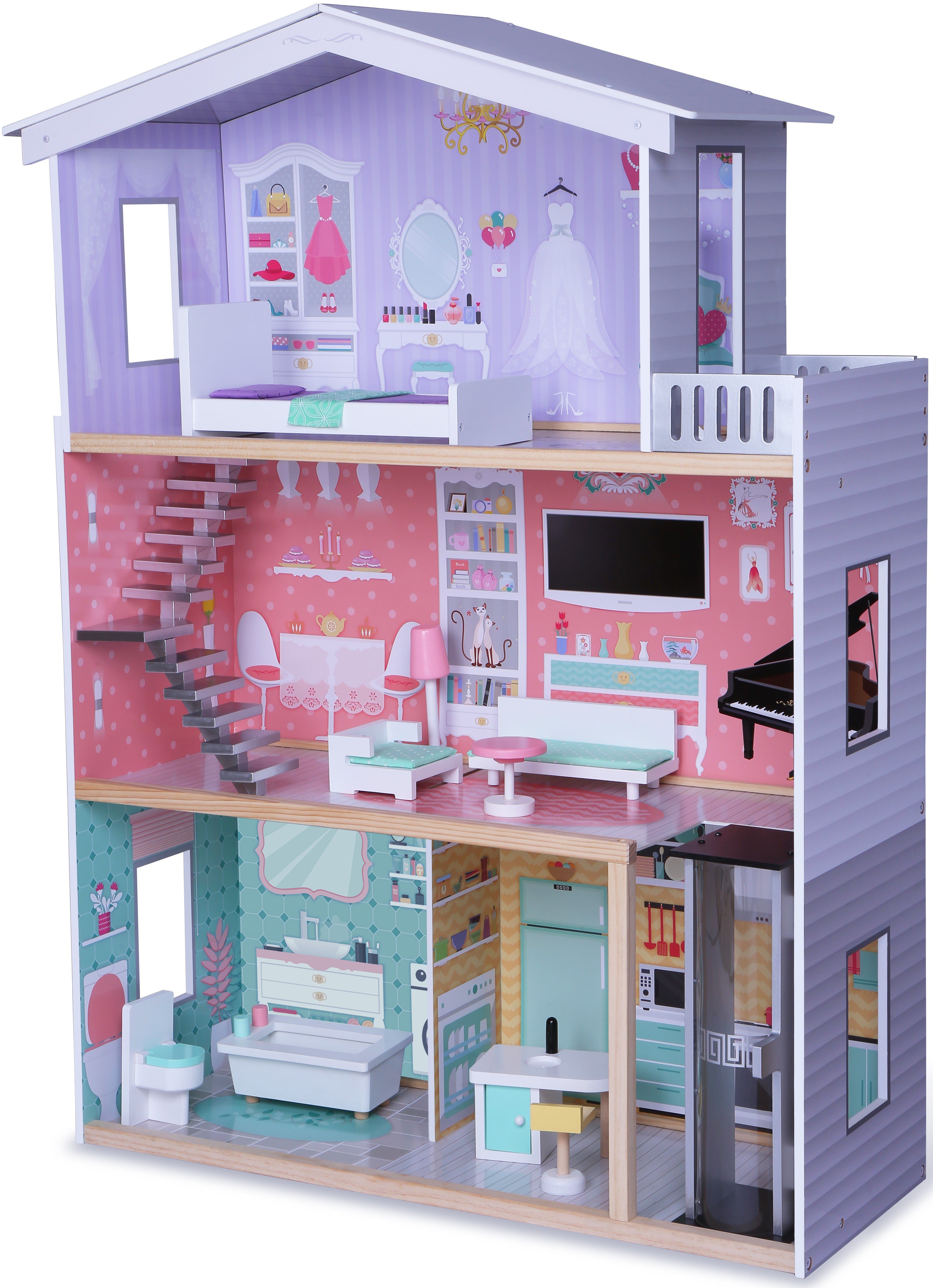 Stort dukkehus fra Edufun med mange sjove legeområder med medfølgende møbler til at indrette huset med. Perfekt til timevis af fantasifuld leg. - 3 etager. - Komplet møbelsæt til dukkehus. - Flotte detaljer. - Dæmpede farver. - Unikke tapeter i alle rum. - Moderne og tidløst design. - Udvikler kognitive og finmotoriske færdigheder. - CE-mærket. - Anbefalet alder: Fra 3 år. - Træ, papir, stof, metal.
