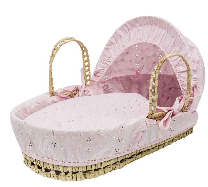Denne Miniature-størrelse Kinder Valley dukke Moses kurv / Lift vil holde din lille underholdt i timevis. Sengesættet er lavet af vores bløde letplejende polybomuldsstof og har et klassisk Broderie Anglaise design. Denne håndlavede Palm Moses-kurv er en m