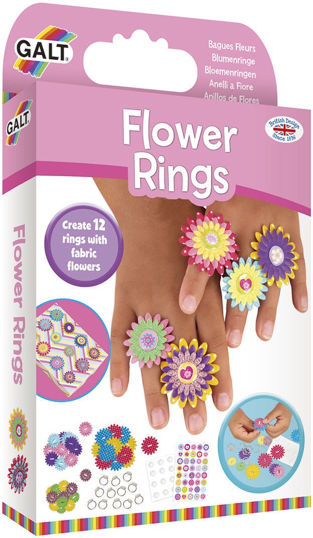 Lad dit barn fremstille sine egne blomsterringe med dette sæt fra Galt. Sættet indeholder alt det du skal bruge til at fremstille forskellige ringe, som du kan bære selv eller forære til venner. Pakken indeholder 12 ringe med justerbar størrelse, stof og stickers til 12 blomster og en bakke til at fremvise ringene på. En vejledningsguide medfølger. Anbefalet alder: Fra 6 år.