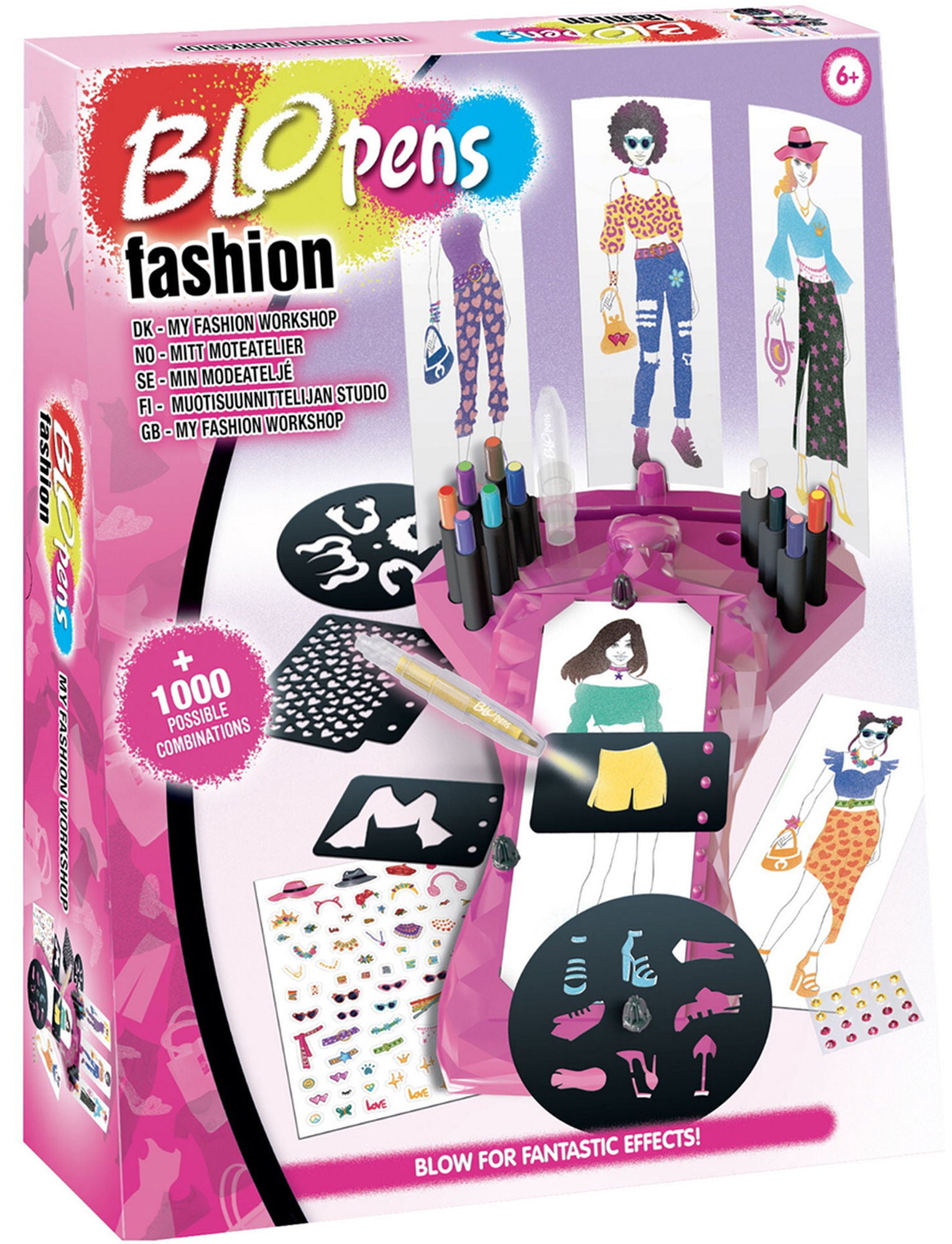 Bliv en rigtig stylist med dette Fashion-sæt fra Blo Pens. Du kan vælge mellem forskellige hårstile, toppe og underdele, sko, tasker og tilpasse farverne på dine outfits ved at lægge mønster til, takket være Magic Blo Pens. Sæt prikken over iet med solbriller, armbånd og meget mere ved at bruge klistermærkerne. Indeholder: 1 stylingbase, 20 genbrugsbare skabeloner, 20 modelark, 1 klistermærke, 10 Magic Mini Blo Pens + 1 aktivator, 1 geletus og 1 brugsanvisning. Anbefalet alder: Fra 5 år.