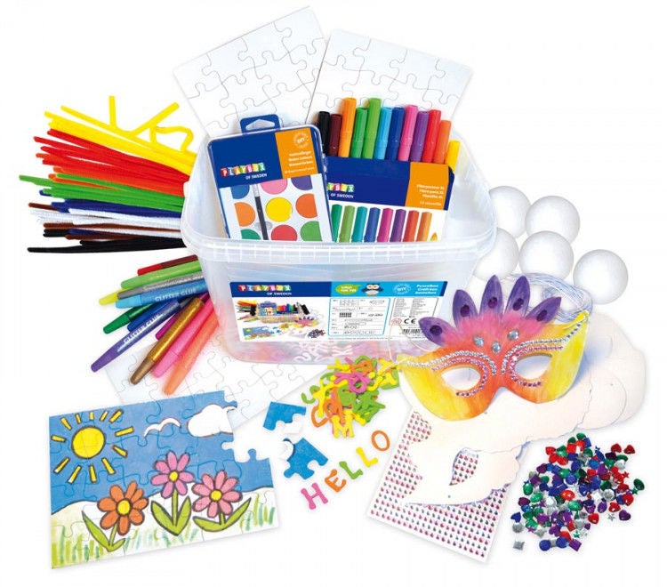 Kreativ kasse fra Playbox med 1100 dele. Lav dine egne puslespil eller udklædningsmasker og dekorér dem med glitter og krystaller. Du kan også lave figurer ved hjælp af piberensere og styroporkugler kun fantasien sætter grænser. Sjov aktivitet for både børn og voksne! Indeholder: - 12 stk. glimmerlim - 400 stk. bløde bogstaver - 16 stk. papirsmasker - 1 stk. tegnepuslespil - 12 stk. tykke tegneredskaber - 525 + 150 stk. krystalstene - 1 stk. vandfarvepalet - 8 stk. styroporkugler - 50 stk. piberensere Anbefalet alder: Fra 3 år. OBS! Puslespillet er tilfældigt udskiftet med et partysæt med slips, briller og butterfly.