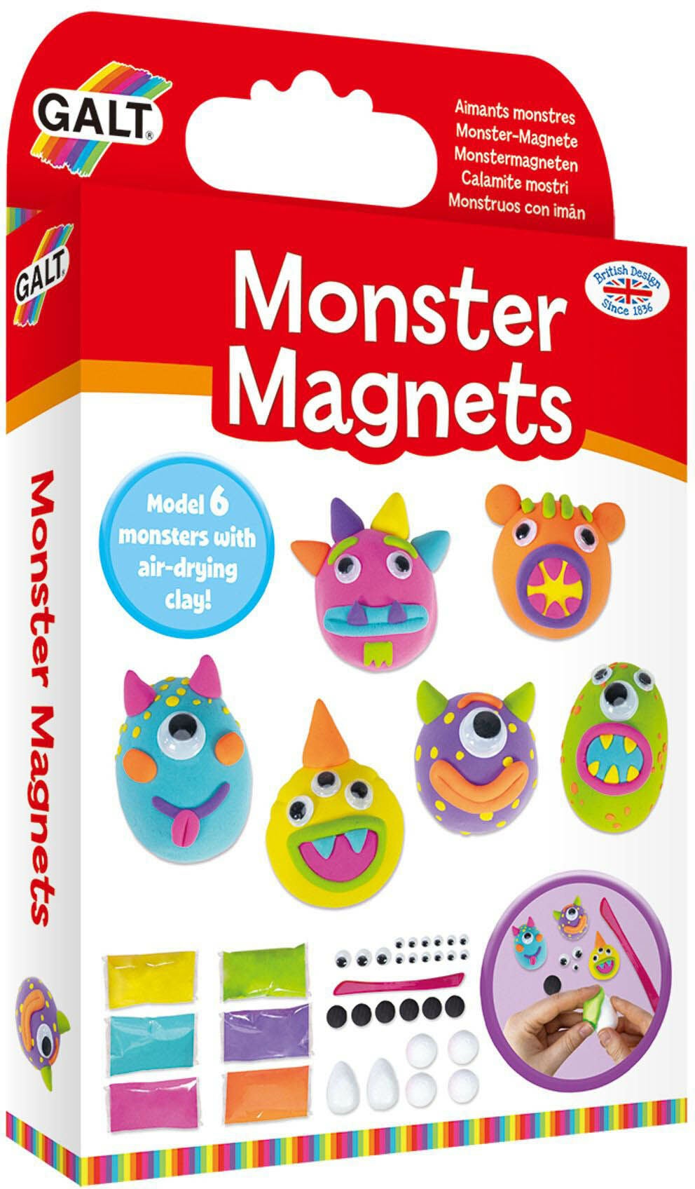 Sjovt kreasæt fra Galt. Brug den bløde ler til at lave dine egne uhyggelige monstermagneter. 6 x 14 g blød ler. Modelleringsværktøj. 6 flamingokopper. 6 selvhæftende magneter. 15 øjne. Vejledning medfølger. CE-mærket. Anbefalet alder: Fra 6 år.