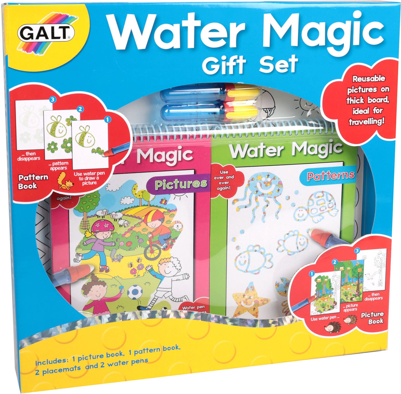 En flot gavepakke fra Galt, indeholdende et kit med genanvendelige billeder der kan farvelægges med vandpenne. Fyld pennen op med vand og mal de skjulte billeder frem. Kan gøres om og om igen!