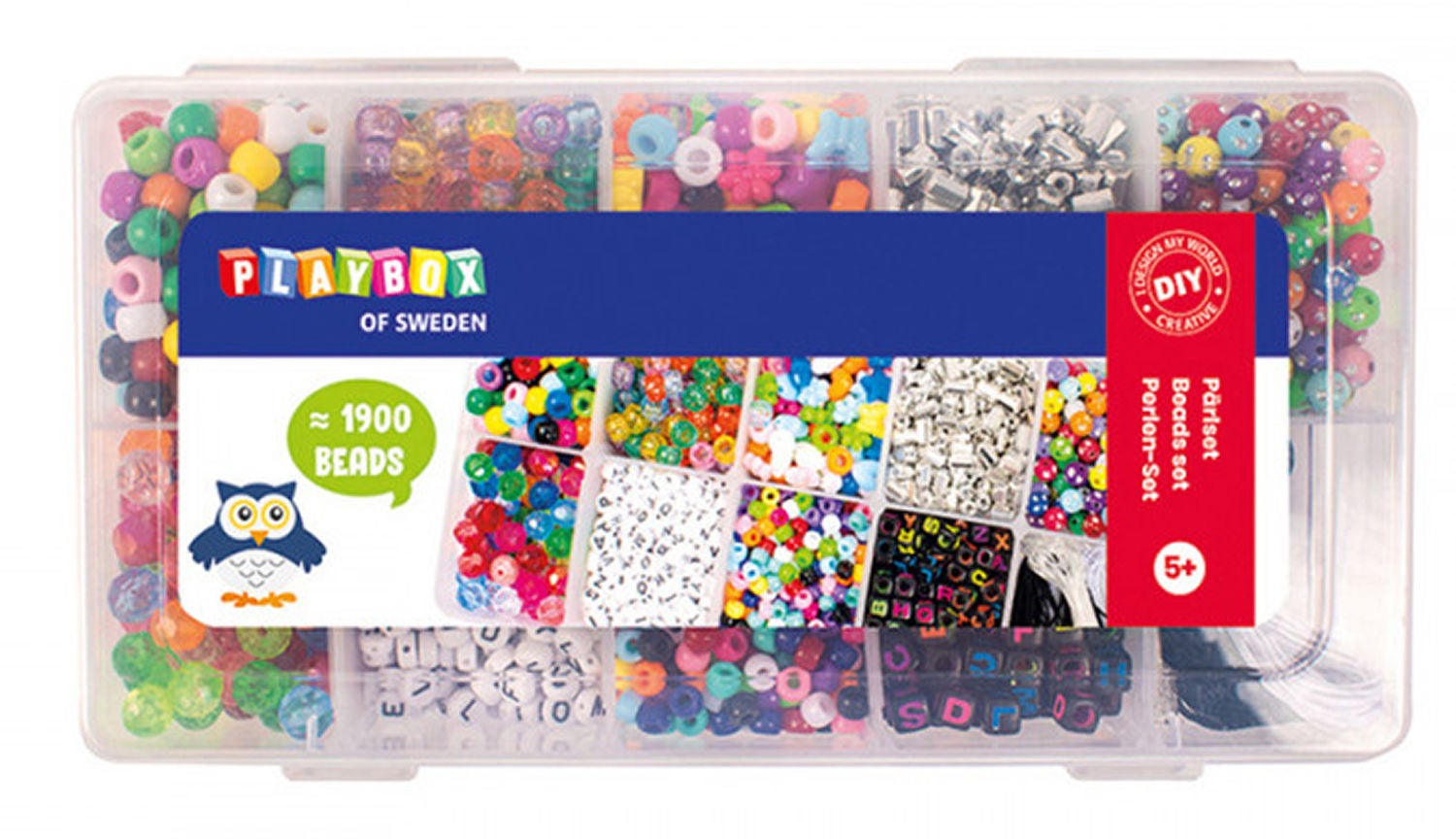 Et krea sæt fra Playbox bestående af en opbevaringskasse fyldt med 1900 forskellige perler. De mange perler i forskellige former og farver gør det muligt for børnene at skabe fantasifulde armbånd og halskæder eller måske en personlig udsmykning af nøgleringen. Perlerne kan bruges på et utal af kreative måder i forskellige form- og farvekombinationer.
