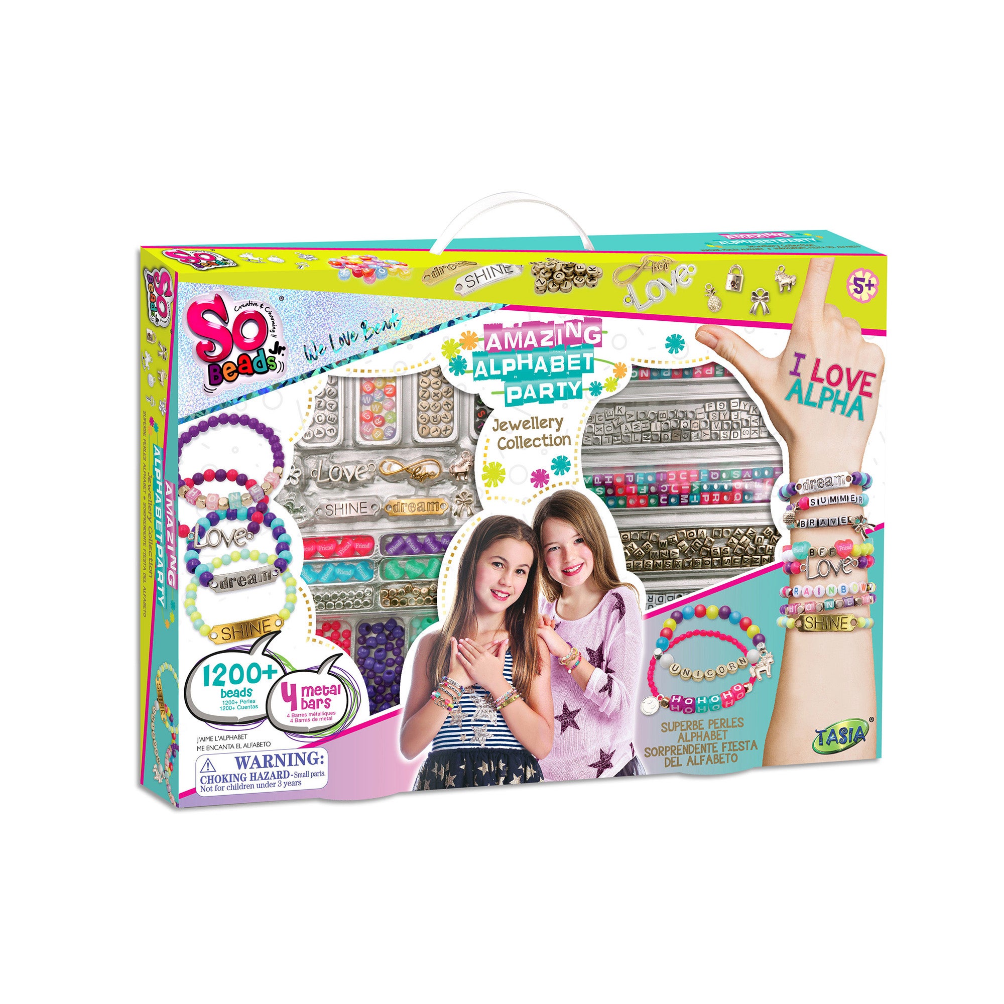 Armbåndssæt fra So Beads med farverige perler og bogstaver. Perfekt til at skabe egne smykker med. - Farverigt design. - Kun fantasien sætter grænserne. - CE-mærket. - Anbefalet alder: Fra 5 år. - Plastik, metal.