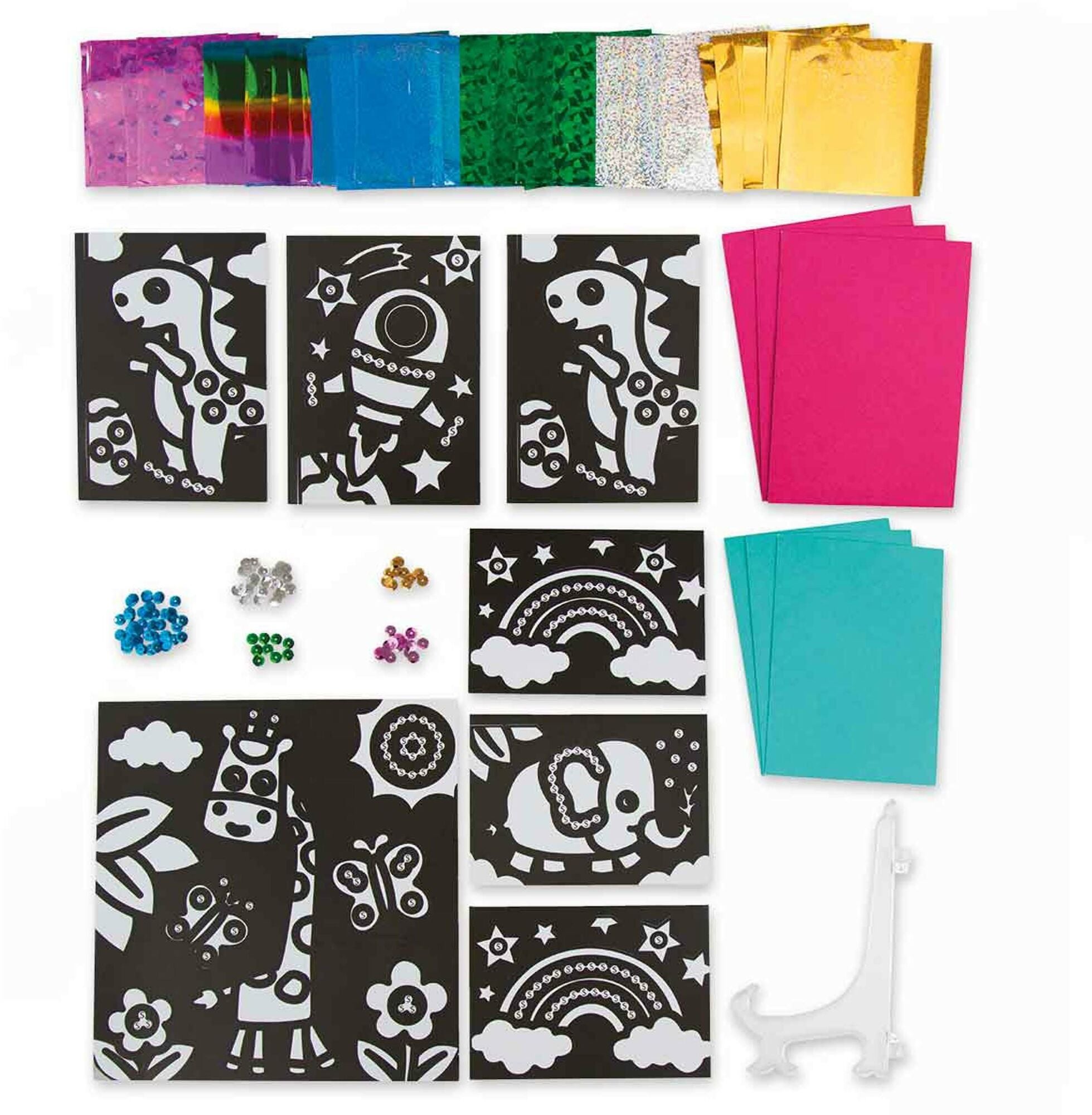 Farverigt kreasæt fra Out Of The Box. Lav 6 fantastisk glitrende lykønskningskort og et stort billede ved hjælp af folier og pailletter. Perfekt til kreative aktiviteter. CE-mærket. Anbefalet alder: Fra 3 år.