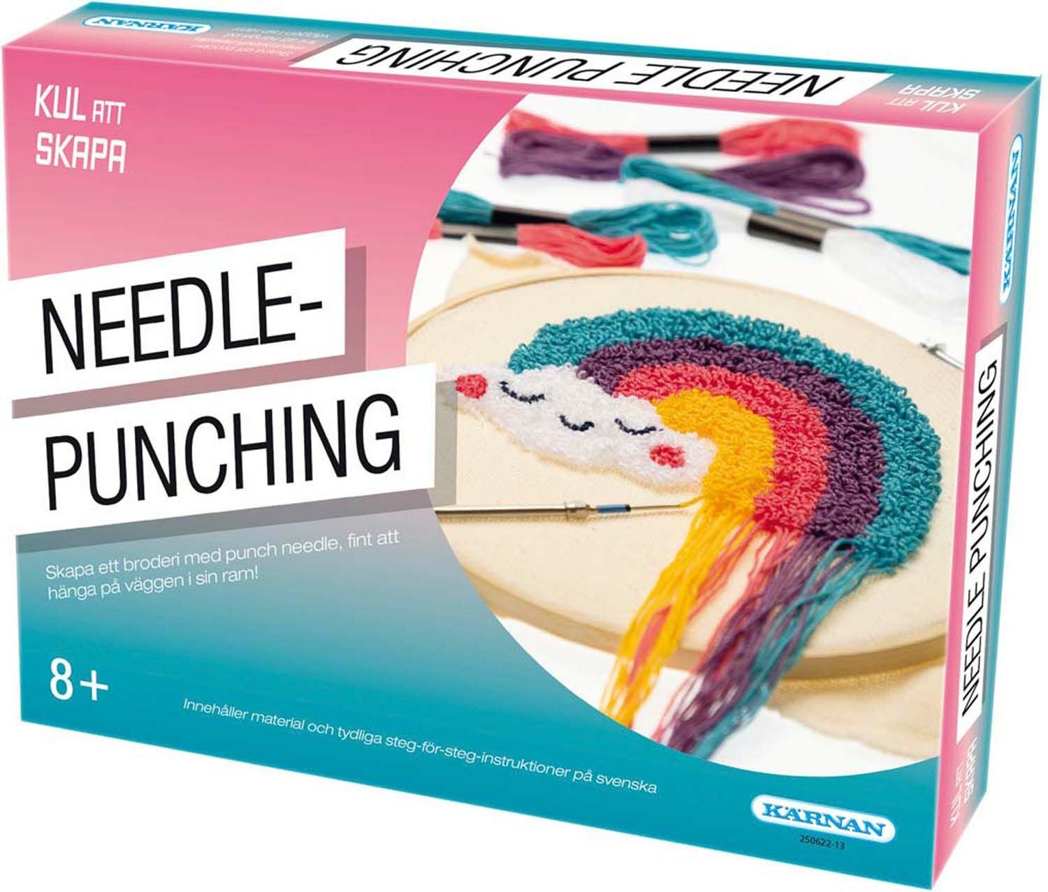 Kreativt Needle Punching kreasæt fra Kärnan til broderi. Værktøj, materialer og instruktioner medfølger. CE-mærket. Anbefalet alder: Fra 8 år.