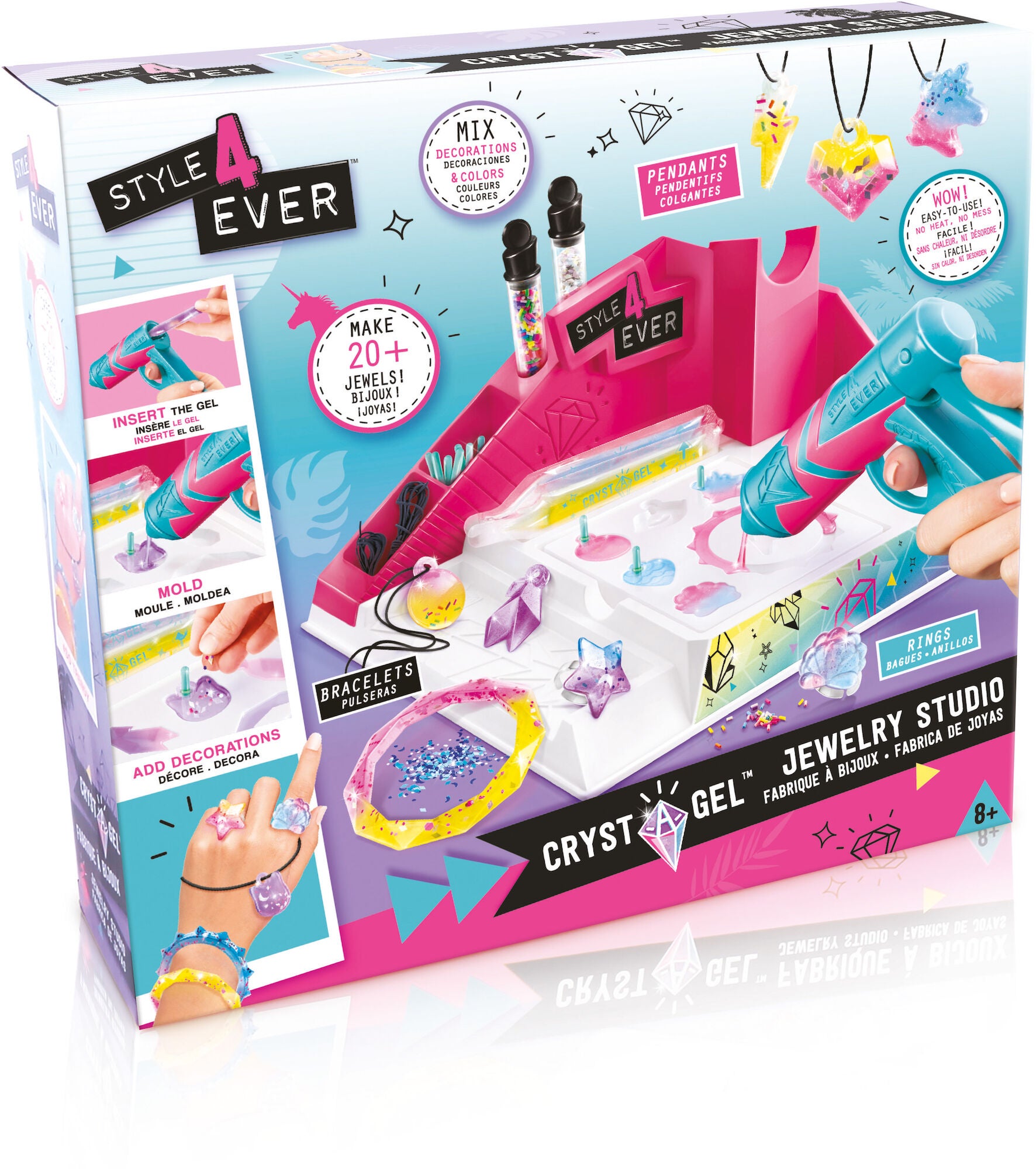 Smykkeværksted fra Style4Ever med gelé til at lave helt egne vedhæng, armbånd, øreringe og ringe med. Det har forme og dekorationer til at gøre oplevelse ekstra personlig. Fyld gelépistolen med gelé, fyld formene og dekorér, som du vil. Smykket er klar til brug efter blot 1 time. Perfekt til kreative stunder. Indeholder: 1 gelépistol, 6 gelépakker, 6 dekorationssæt, 2 ringe, 1 værktøj, 2 tuber, 1 snøre. CE-mærket. Anbefalet alder: Fra 8 år.