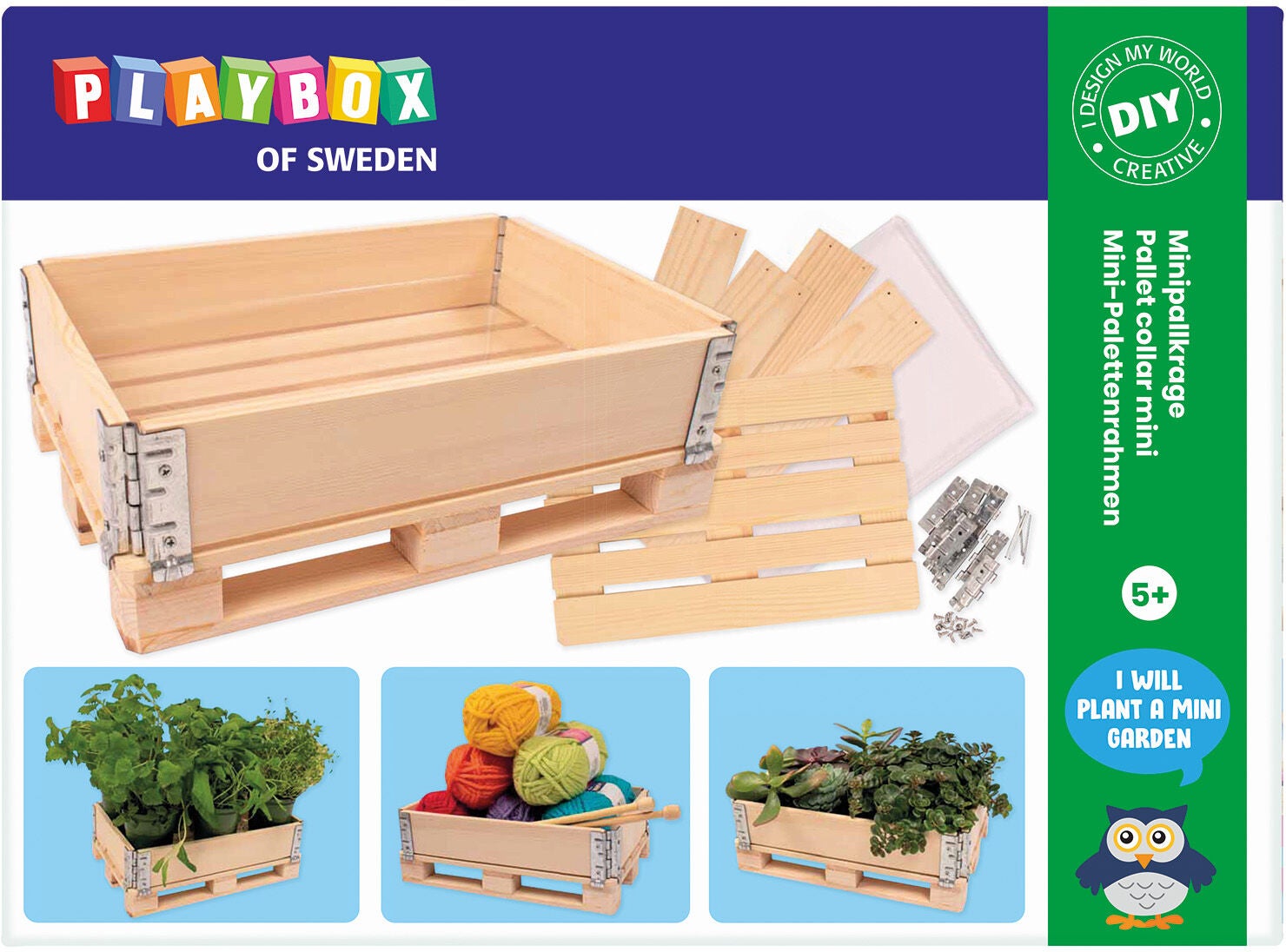 Kreasæt fra Playbox som hjælper dig med at bygge din egen mini-palle. Pallen kan stables og er perfekt til små steder som i vinduet eller på altanen. Perfekt til at lære barnet om havearbejde. CE-mærket. Indeholder: 1 palle, 1 palle, 4 hængsler, 16 skruer, 1 bakke, 1 brugsvejledning. Anbefalet alder: Fra 5 år.