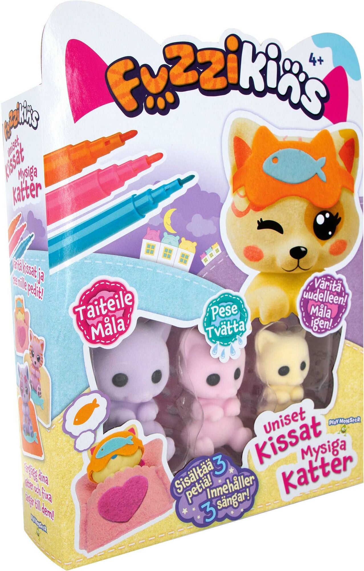 Farvelæg disse søde kattes pels med de medfølgende vandopløselige tusser. Når du vil ændre kattenes udseende, skyller du dem blot under rindende vand, lader dem tørre og farvelægger dem om igen. Kattene har også soveposer, der kan dekoreres. En inspirerende kombination af kreativitet og leg! Forpakningen indeholder 3 katte i forskellige størrelser, 3 vandopløselige tusser og stof.