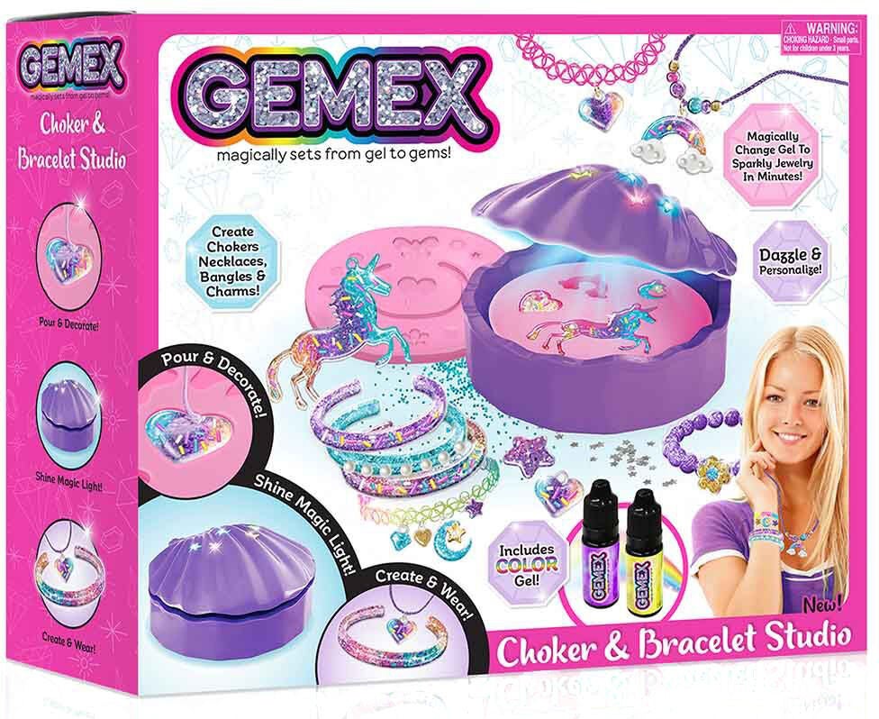 Halskæde- & armbåndsstudio fra Gemex med meget tilbehør til at skabe fine og unikke smykker med. Det har forme og glitrende ædelstene i forskellige former og farver samt to farvede geléer. Vælg en form, hæld geléen i formen og tilføj ædelsten og dekorationer. Start studioet og efter 3-5 minutter er geléen stivnet, og dit smykke er færdigt. Perfekt til kreative aktiviteter. Indeholder: Et studio, to forme, to flasker farvegelé, flere forskellige ædelsten og andet praktisk tilbehør. CE-mærket. Anbefalet alder: Fra 5 år. Batterier medfølger ikke.