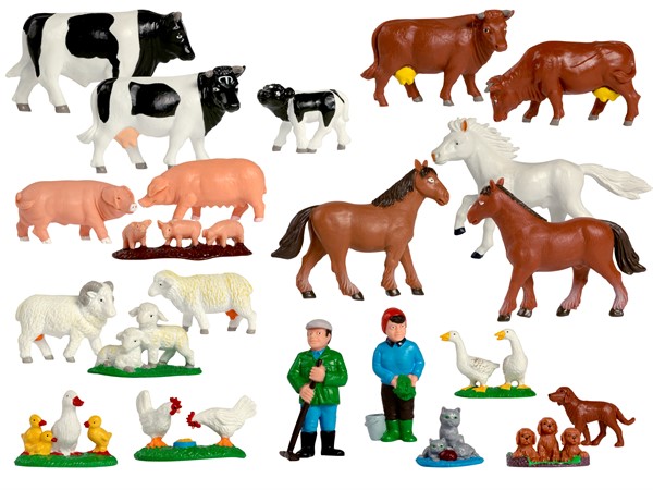 På bondegården er der altid noget at lave, og med de her fine figurer kan man få mange skønne lege i gang.Leg og lær om de forskellige dyrIndeholder: Bondemand og bondekoneHeste, grise, køer, fårHøns, gæsHund og kat . Vær opmærksom på, at det ikke er alle dyrene, der kan stå selv.Mål: mellem 2 og 7 cm.