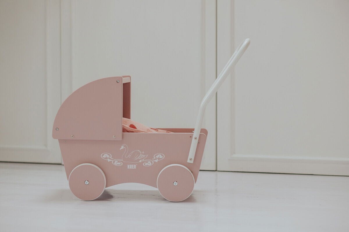 Denne KREA Dukkevogn Rose (36-2028) er lavet i træ og har en charmerende lyserød farve med...