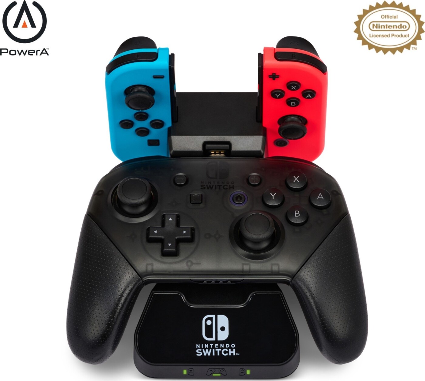 Hold din Joy-Con-controller, Pro-controller til Nintendo Switch og PowerA trådløse controllere til Nintendo Switch tændt med denne pålidelige opladestation med lav profil. Specifikationer: ...