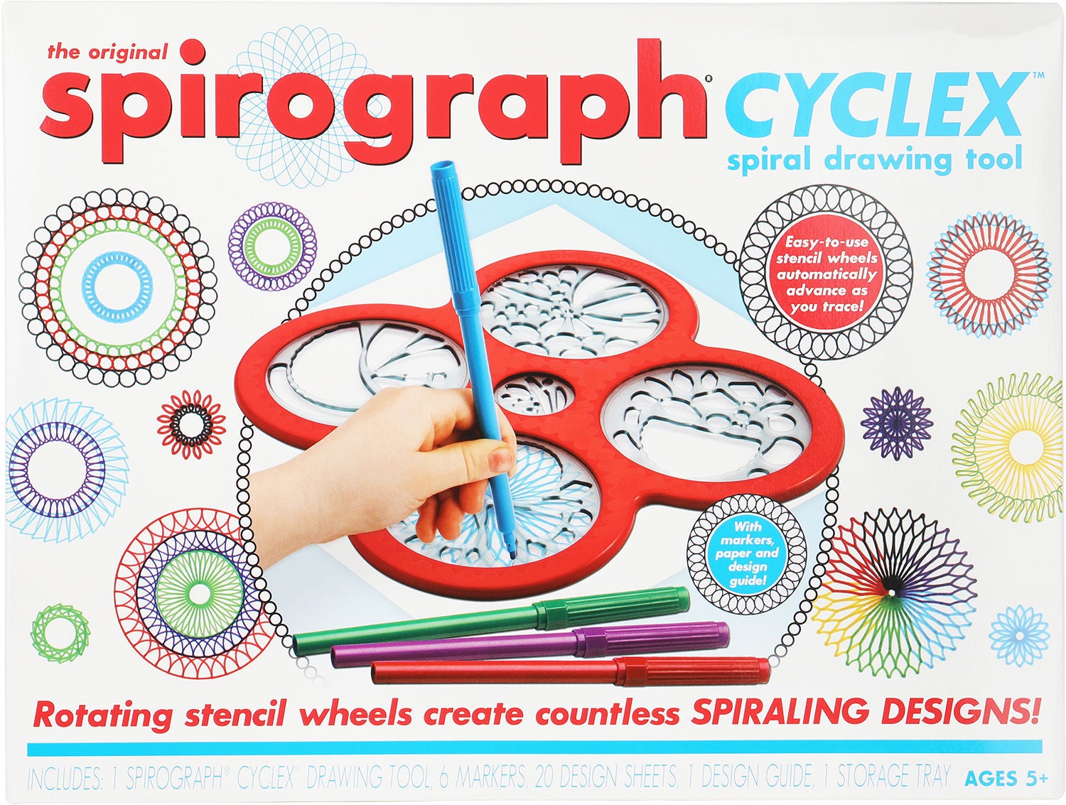 Cyclex er smart tegneværktøj fra Spirograph. Lad dit barn tegne fantastiske mønstre med Spirograph, der forener elementer fra matematikken og kunsten. Ved hjælp af de simple tegneværktøjer kan du og dit barn kreere massevis af forskellige mønstre. Tegneværktøjet snurrer automatisk fremad, mens du tegner og følger den valgte skabelons mønster. Pakken indeholder Cyclex tegneværktøj, 20 papirark, 6 penne og illustrerede instruktioner. Anbefalet alder: Fra 5 år.