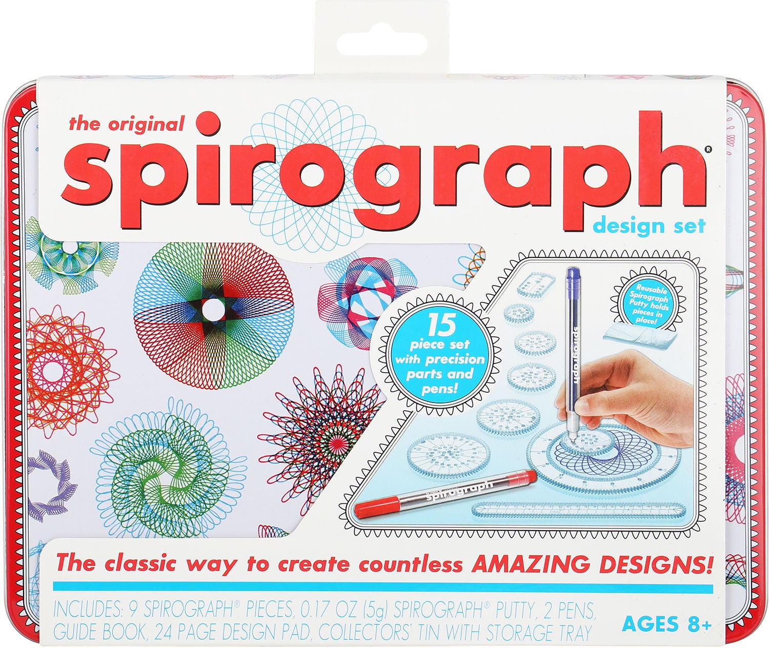 Et fint sæt i en metalæske fra Spirograph. Lad dine børn lave fine mønstre, med denne klassiske Spirograph, der forener elementer fra matematikken og kunsten. Brug de enkle tegneværktøjer til at lave forskellige mønstre. Den robuste metalæske indeholder: 6 runde skiver, 1 ring, 1 formskive, 1 stang med takker, 2 tusser, Spirograph hæftemasse, tegnebog m. 24 sider og illustrerede instruktioner. Anbefalet alder: Fra 8 år.