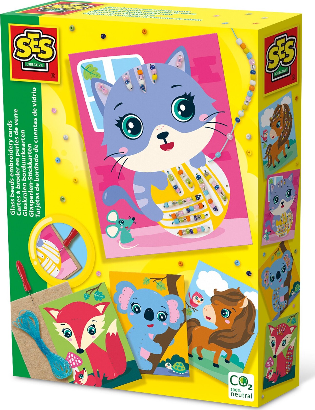 Fire muntre kort til at brodere med glasperler! Læg kortet efter eget valg på filt og prik alle hullerne i kortet med stiften. Træk derefter de muntre glasperler på den elastiske tråd og pynt...