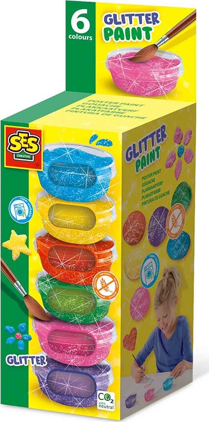 Glitterplakatmalingen fra SES Creative er kendt for sin gode kvalitet og lyse, funklende farver. Glitterplakatmalingssættet består af de seks glitrende farver pink, lilla, gul, rød, grøn og blå....