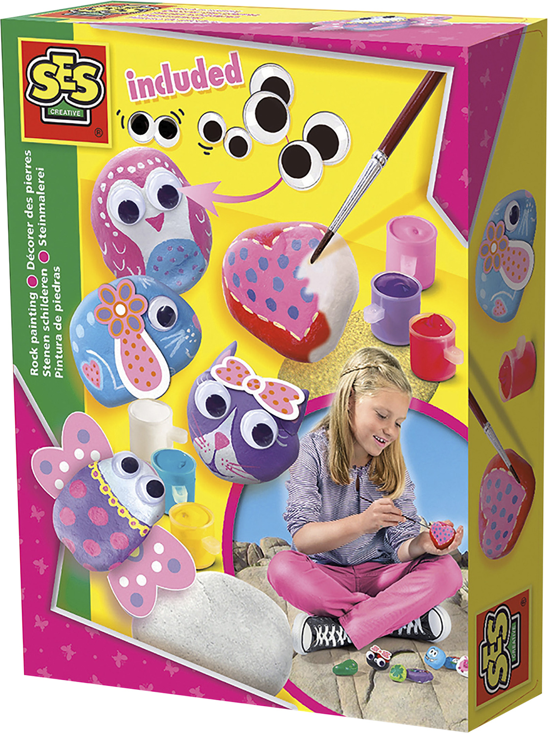 Sættet indeholder smarte malerfarver og flotte sten, du kan male.Du kan også lave dem til sjove små dyr. De medfølgende øjne bevæger sig.Indhold: 5 sten og 8 øjne med bevægelse i forskellige størrelser,Maling med 6 farver, malerpensel og lim samt tilbehør