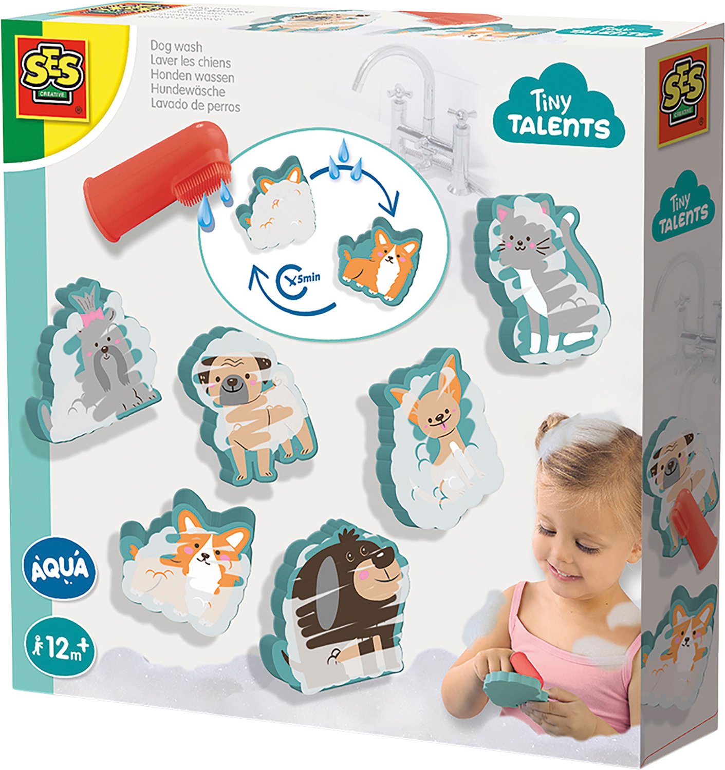 Hundene har leget i mudder og er blevet meget snavsede.Vask dem, så de bliver helt dækket med skum! Skyl dem af i badevandet, så de bliver synlige igen.Brug den medfølgende fingerbørste! Både til bad og brusebad. 6 skumhunde, der er skjult i sæbe, fingerb