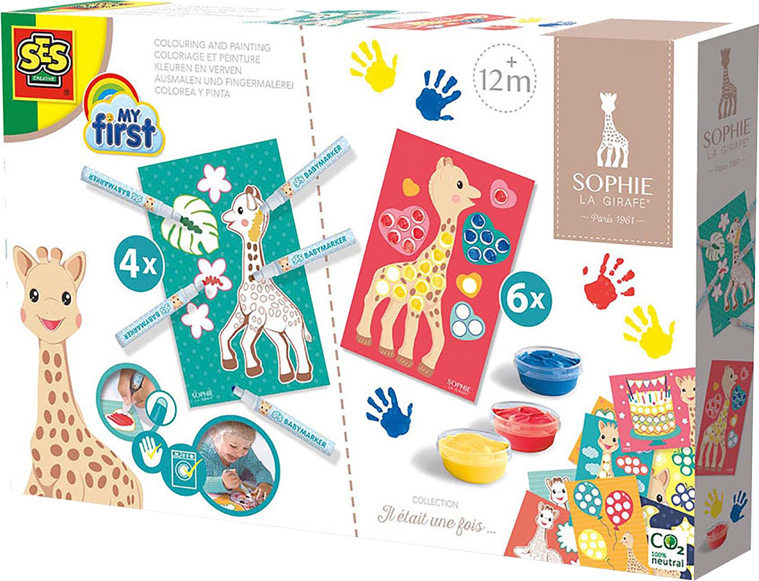 Med dette sæt fra Sophie la Giraffe, kan du både male og tegne. Der er 6 kort til at male på og 4 kort til at tegne på.Indhold: gul, rød og blå fingermaling, 5 babytusser og 10 tegne -og malekort.Emballage: 20x30x4cmProduceret i HollandAlder: 1-4 år