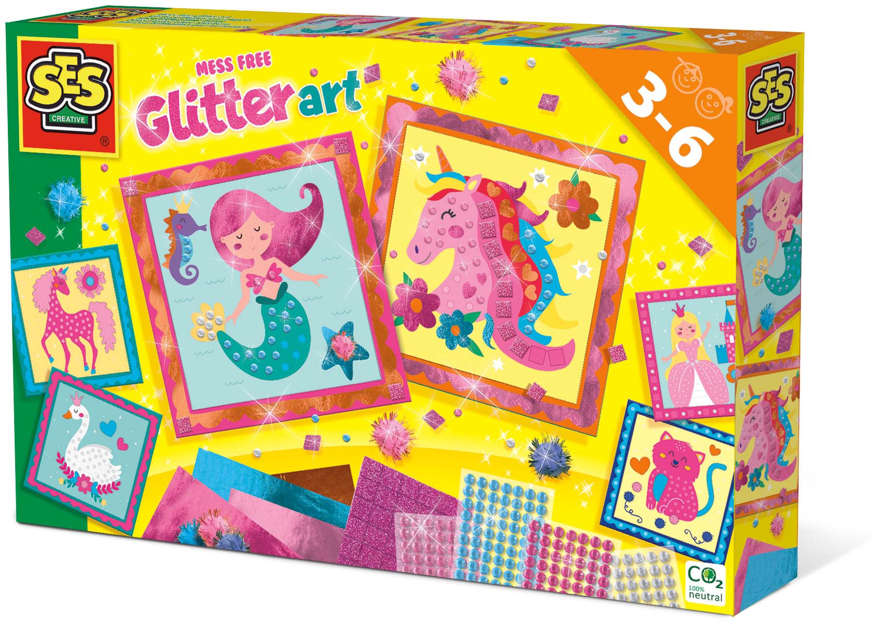 Pænt glittersæt fra SES. Perfekt til kreative børn! - Lav kreative projekter med glitter uden alt svineriet. - Indeholder seks klistermærkekort, som du kan dekorere med glinsende folie, diamantklistermærker, glitterskum-klistermærker og pomponer. - Skaberglæde. - Anbefalet alder: Fra 3 år.