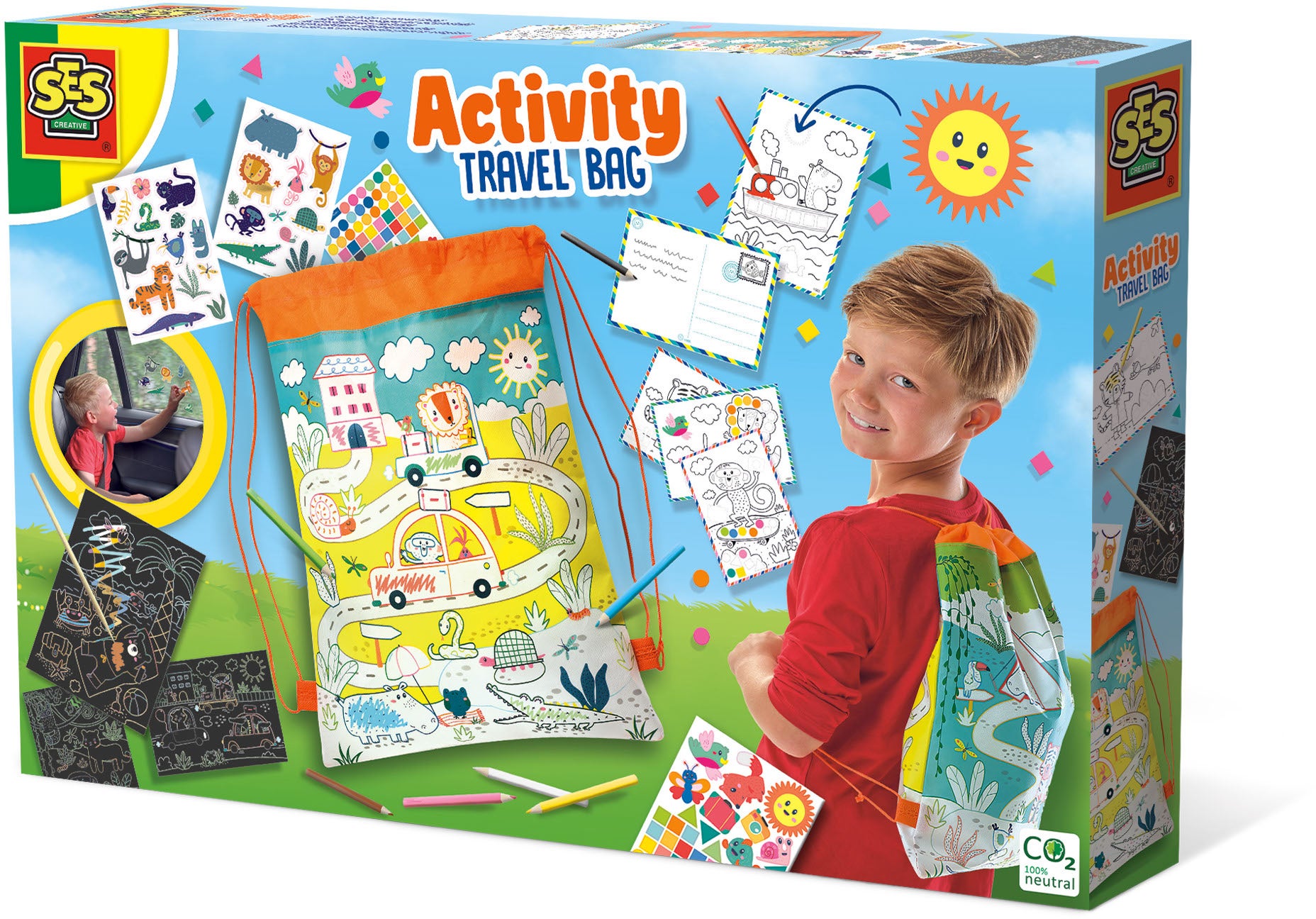 Spændende rejsesæt fra SES. Perfekt til mange timers sjov. - Taske fuld af aktiviteter til rejsen. - Indeholder: 1 gymnastikpose, 3 skrabelodder, 9 blyanter, 2 klistermærkeark, 4 postkort. - CE-mærket. - Anbefalet alder: Fra 3 år.