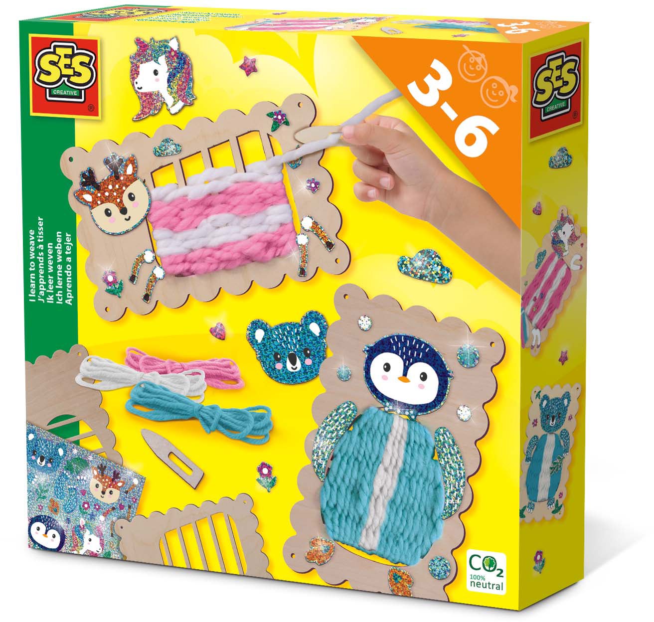 Sjovt vævesæt fra SES. Perfekt til kreative stunder. - Indeholder: 2 vævestolsrammer, 2 vævenåle, 3 forskelligfarvede tråde, 1 klistermærkesæt, 1 brugsvejledning. - Skab søde vævede dyr. - Lær forskellige væveteknikker. - Anbefalet alder: Fra 3 år.