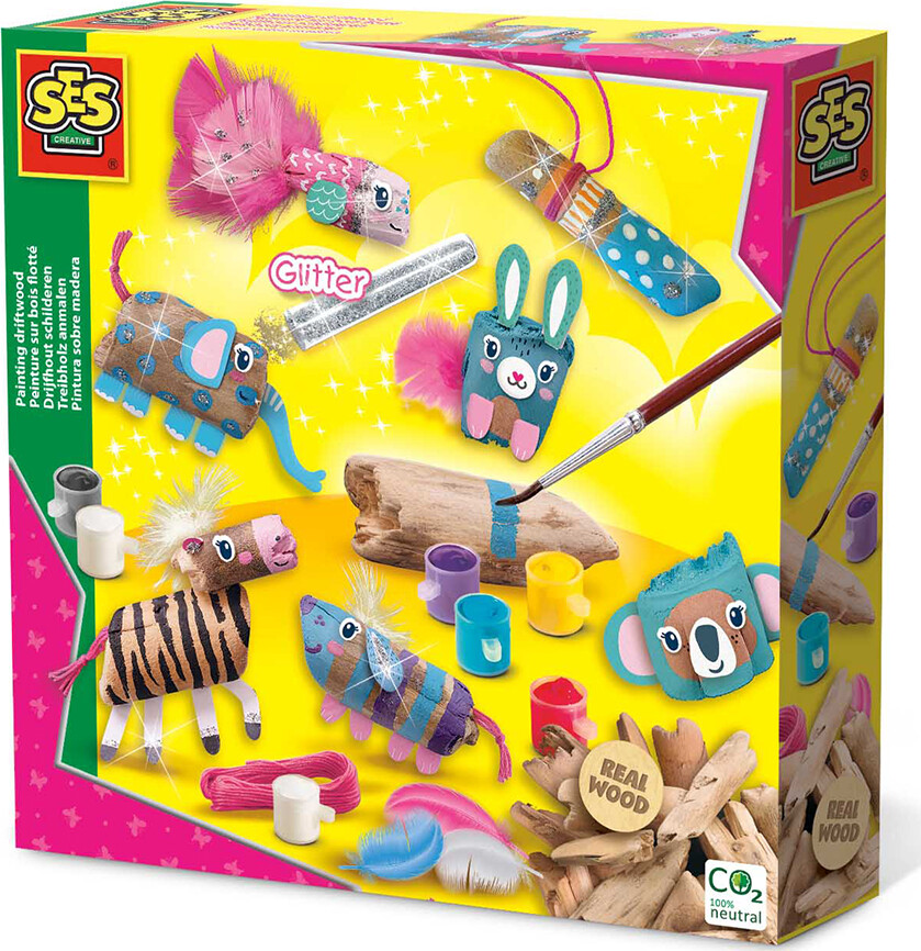 Brug din fantasi og lav forskellige dyr ud af ægte træ. Du kan bruge fjer, seks farver af maling,...