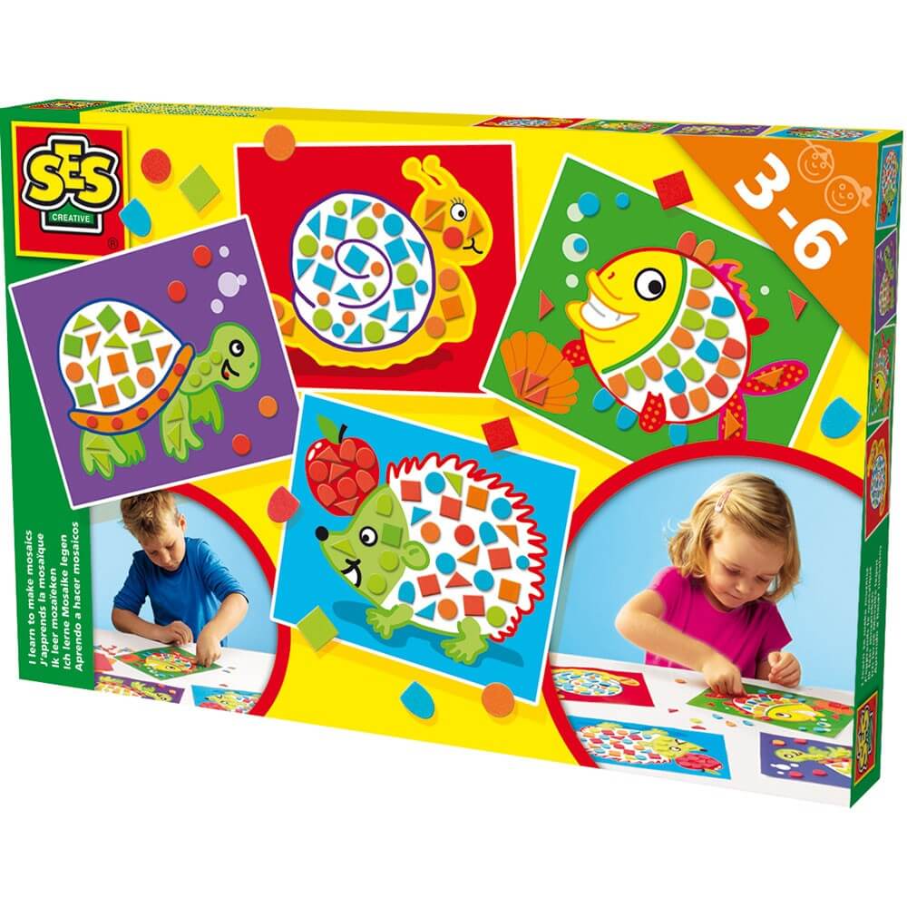 Dit barn kan her lave skønne og farverige mosaikker, uden brug af hammer og ituslået keramik. Åben æsken og legen med former og farver kan gå i gang. En leg med fordybelse i klare farver og glade motiver, og giver for de fleste et flot resultat.Æsken indeholder 4 kort med dyremotiv og mønster på og kartonmosaikker at pynte med.