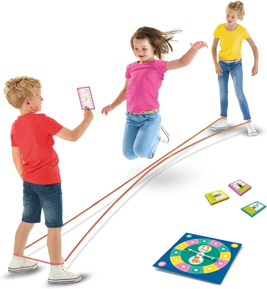 Der er alt for mange børn, der ikke har hoppet i elastik. Sikke en skam!Her kan I komme godt igang, både derhjemme og i institution eller skole. Sæt elastikken mellem to stole, stiger eller ben og vælg en hopper. Nu skal en af deltagerne eller hopperen selv dreje på hjulet og se, hvilken udfordring, der skal løses på elastikken. Der er 3 forskellige sværhedsgrader. Indhold: 3,5 m hoppeelastik med glitter27 aktivitetskortDrejeskive med pil