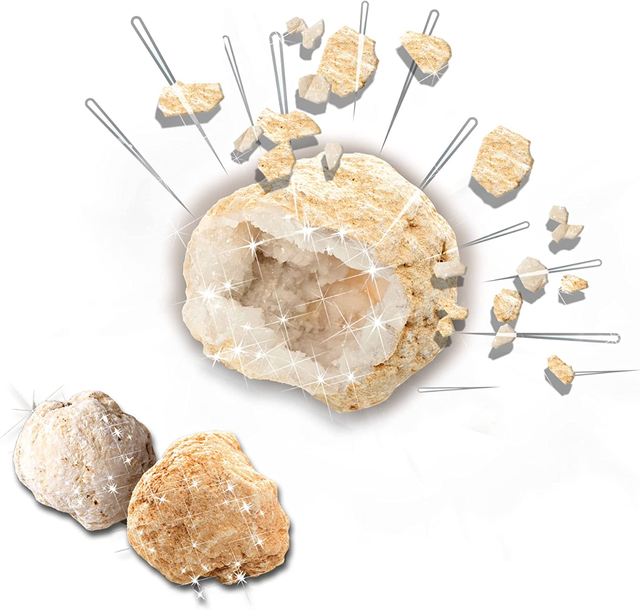 Dit barn har måske set forskellige krystaller og vidunderlige, skinnende og spidse genstande, der på mystisk vis ligesom vokser på sten. Inde i nogle af krystallerne kan der være hulrum, som kaldes geoder. Her er der 3 sten, der på ydersiden ser ret kedelige ud, men så skal I bare se løjer, når I slår hul på dem. Det kræver ikke supermandskræfter at gokke stenene åbne. Men sørg alligevel for at have en hammer. Stenene kan godt sprænge lidt, når man slår på dem, så pas på, hvor smådelene kan ende henne.Sikkerhedsbriller er også en god ide.