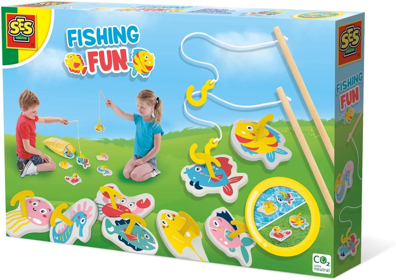 Kan du få en skumfisk på krogen?Tag med ud og fisk de 8 små fisk, som har kroge på ryggen. Det er en god udfordring for hånd-øjekoordinationen og har lidt større sværhedsgrad end fiskespil med magneter. Fiskespil er også en god træning af at vente på tur og tabe og vinde uden (for meget) surmuleri.Du får 2 fiskestænger i træ, 8 skumfisk og en pose, de kan ligge i, når de ikke bliver jaget. Prøv at fiske de gule fisk først eller den, der starter med S. Så træner legen også dit barns farvegenkendelse og ordforråd. C02-neutralt legetøjDet udleder CO2 at producere og transportere legetøj. Hollandske SES Creative kompenserer for dette ved at købe truede eller misholdte skove i Tyskland, som de forbedrer ved at fjerne de syge træer, plante nye og arbejde for bedre biodiversitet.Desuden er alle SES Creatives emballager af lavet af genbrugsmaterialer.