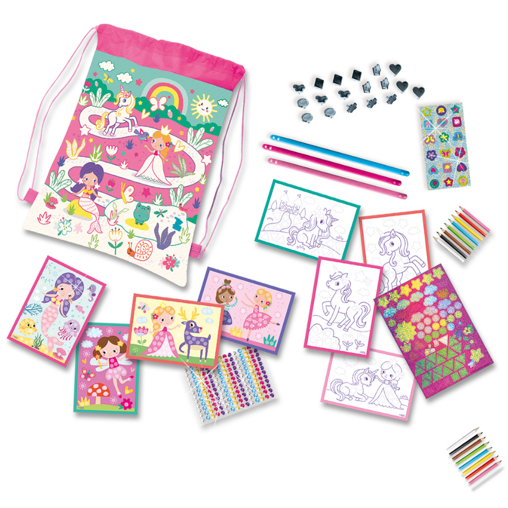Smart sæt der sikrer underholdning på turen. Rygsæk der kan farvelæggesKlistermærker8 farveblyanter3 armbånd med vedhængpostkortselvklæbende diamanter og et diamantmosaik-kort.Produceret i Holland.