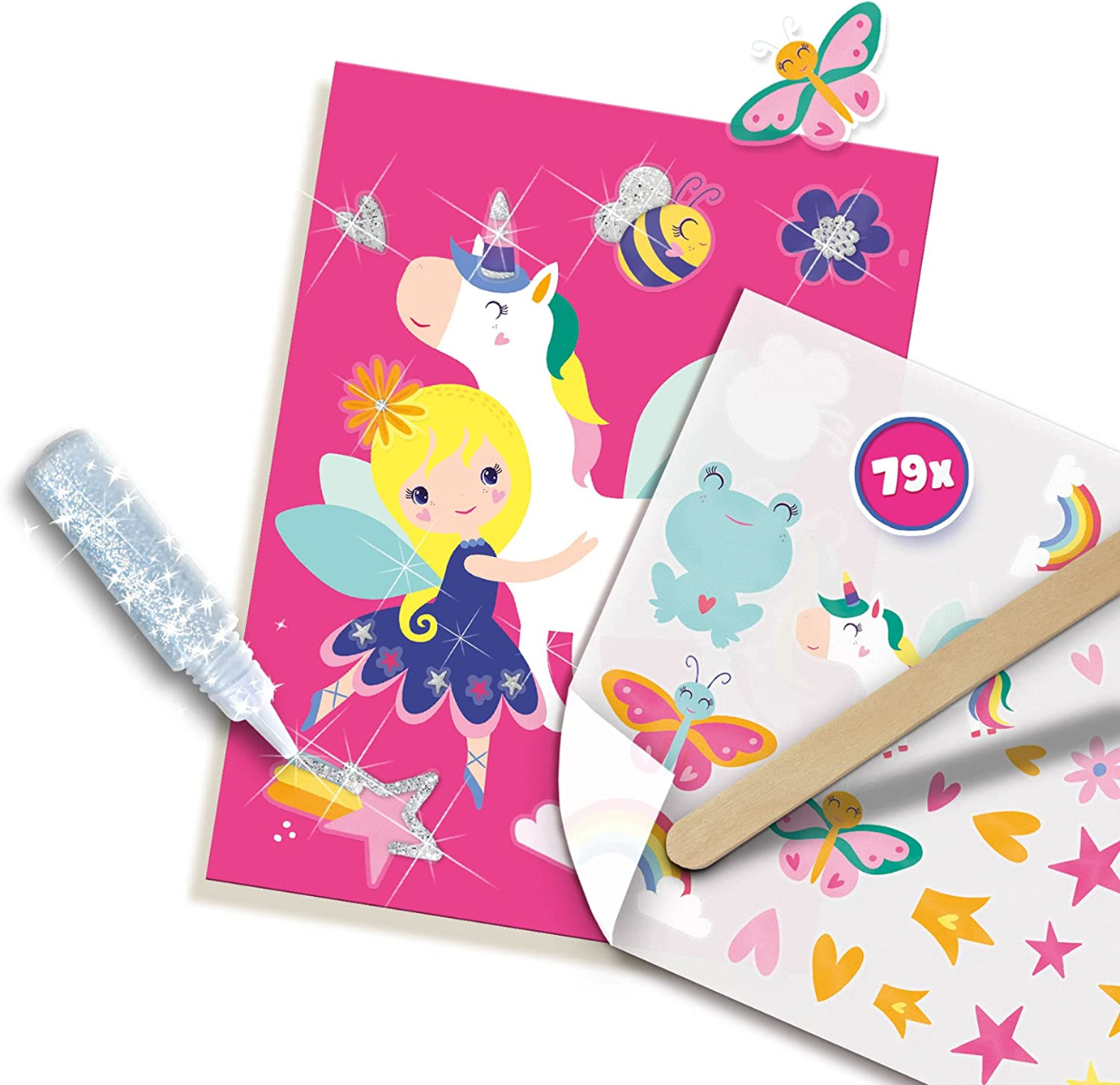 4 kort, glimmerlim og hele 79 overføringsmotiver, som dit barn kan dekorere kortene med. En hyggelig, kreativ aktivitet, der ikke kræver den store ide-rigdom.