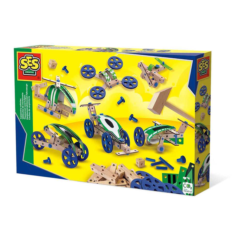 SES Creative Byg Selv-Biler Lav en helikopter, flyvemaskine, drone, racerbil eller dit helt eget kųretųj Indeholder: Tręhammer, 50 dele i trę, 46 samlenåle og som i plasik, 9 ark med bildele, 4 hjul i skum og instruktioner. Alder: 5 år+