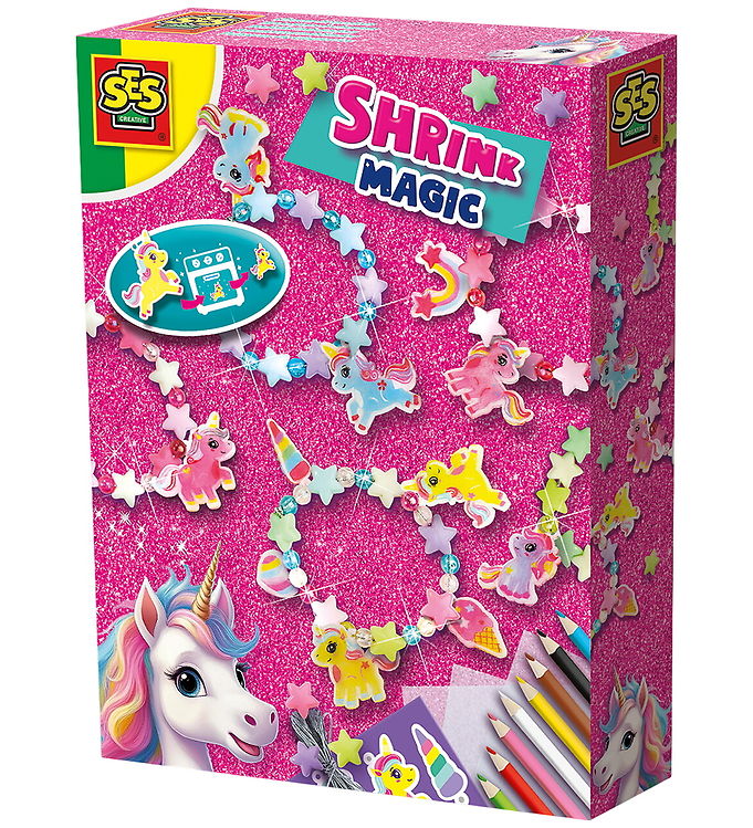 Med SES Creative Kreasæt - Krympeplast - Enhjørning Armbånd kan du udfolde din kreativitet og skabe unikke smykker. Sættet indeholder alt, hvad du behøver for at lave dit eget farverige enhjørning armbånd ved hjælp af krympeplast.