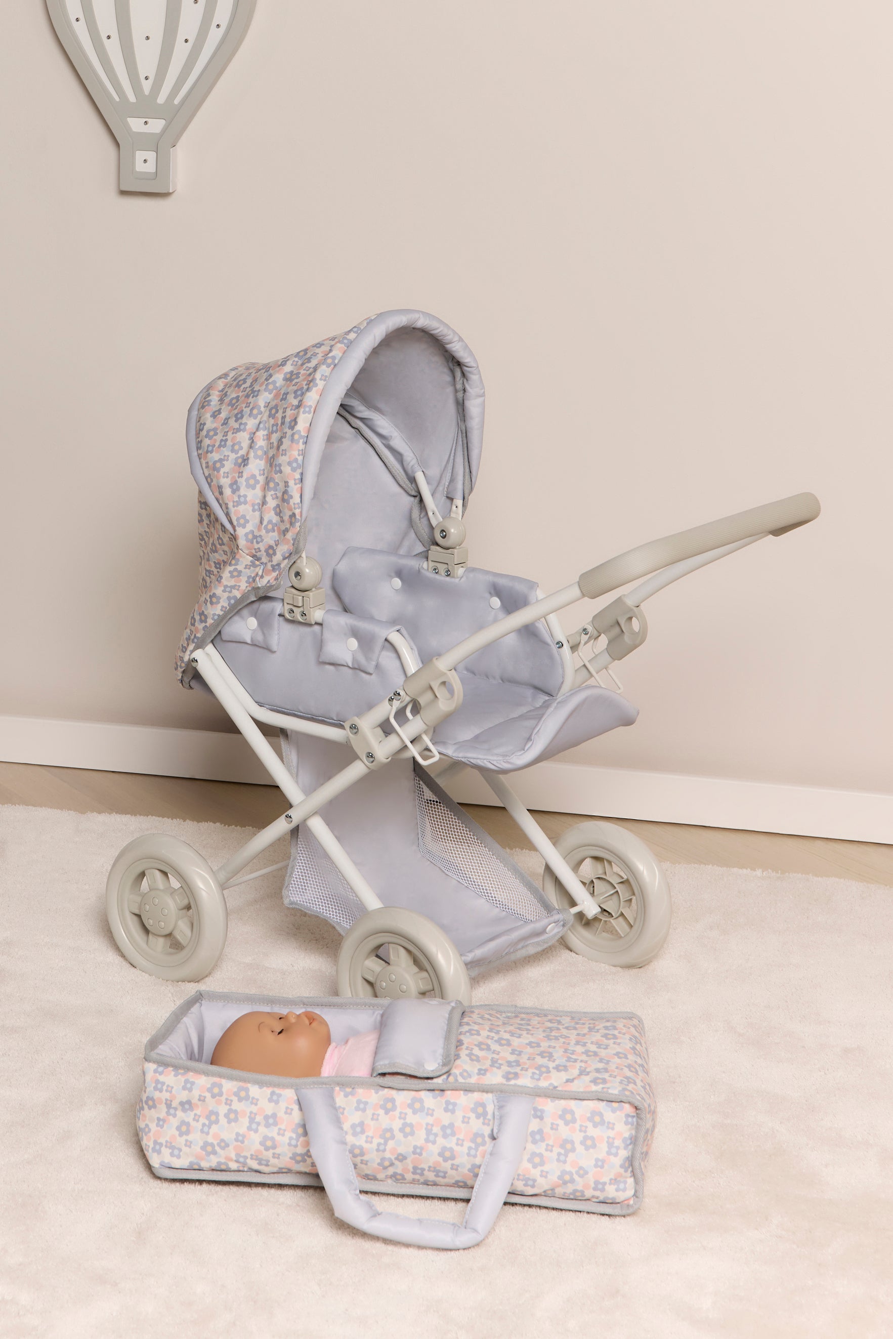 Dukkevogn fra Cloudberry Castle med et fint blomsterdesign. Den har en liggedel der kan tages af og bruges separat med håndtag og en stor opbevaringskurv. Dukkevognen har et styr i EVA-plast, fire hjul i plastik og en stor, aftagelig kaleche. Perfekt til timevis af fantasifuld leg. - CE-mærket. - Maksimal belastning: 25 kg. - Anbefalet alder: Fra 3 år. - Metal, plastik, polyesterstof.